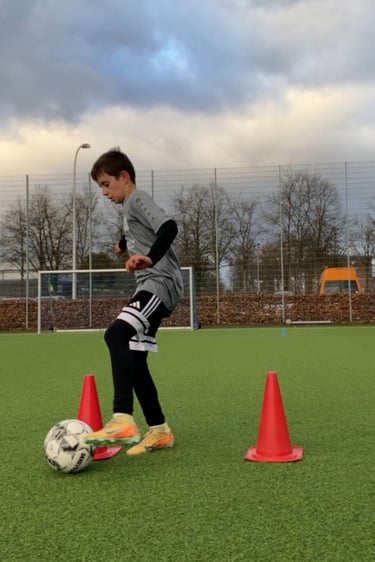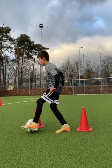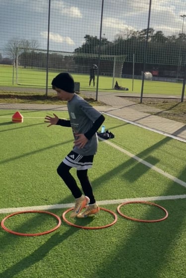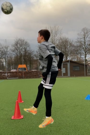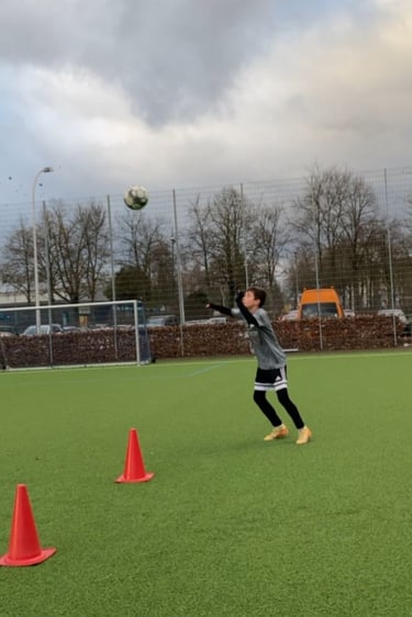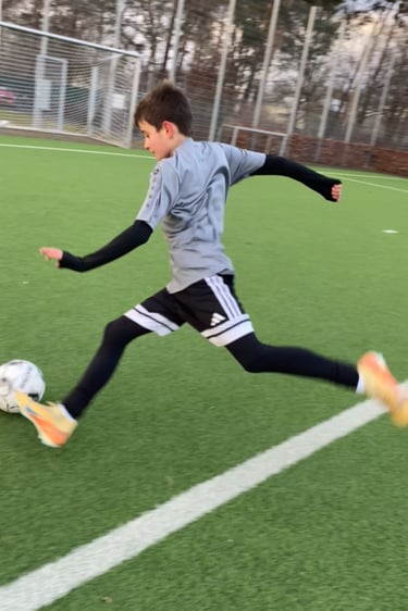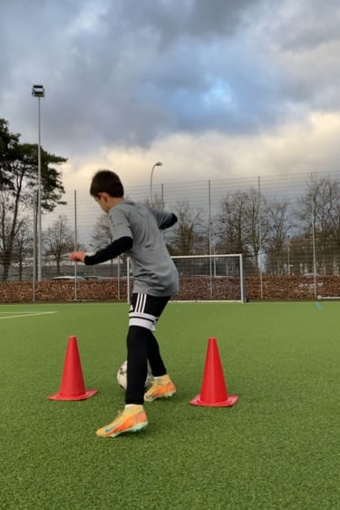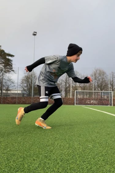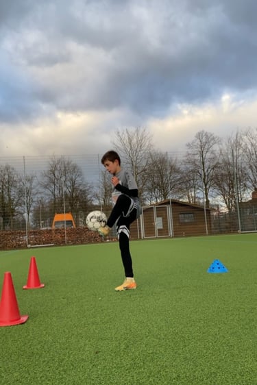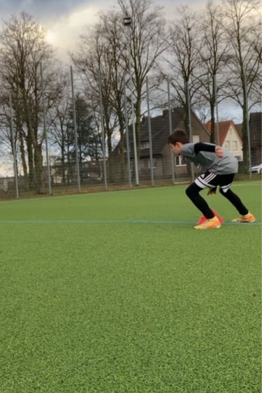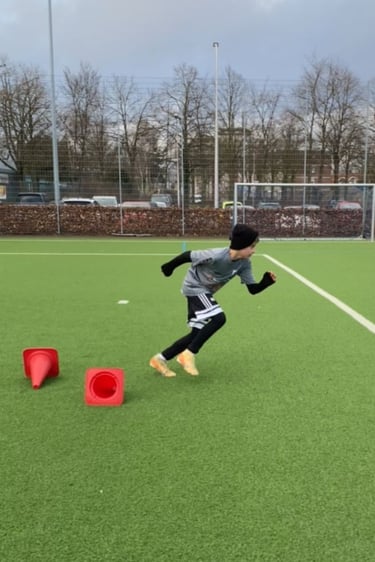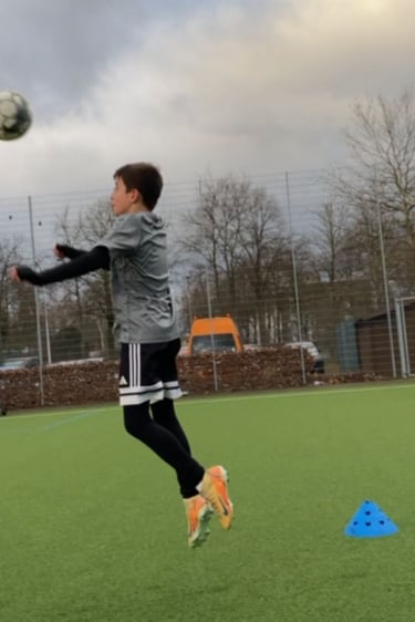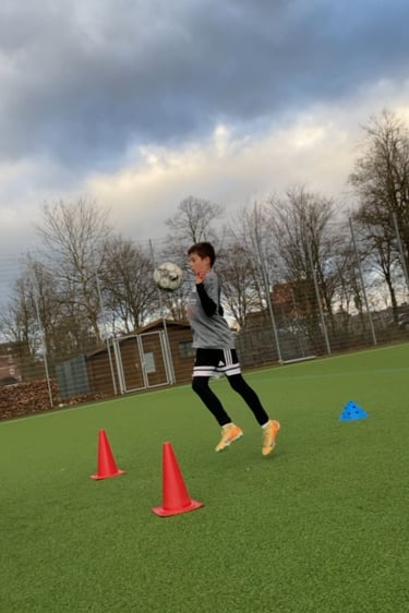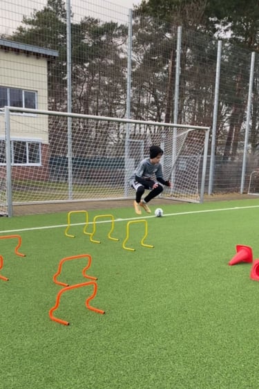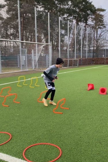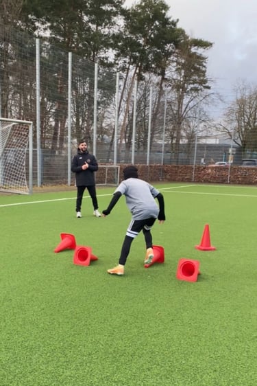 Im Training liegt der Fokus auf Sprungkraft, Koordination und Schnelligkeit, um die athletischen Grundlagen gezielt zu verbessern. Im zweiten Teil der Einheit stehen der erste Kontakt (An- und Mitnahme in einem), Ballkontrolle und Abschluss im Mittelpunkt. Ziel ist es, Bewegungen effizient auszuführen und Aktionen unter Druck sauber, schnell und zielgerichtet zum Torabschluss zu bringen.